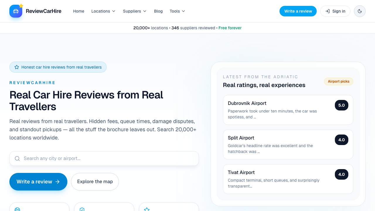 Clean, trust-focused review platform. Star ratings, location search, verified reviews — built to convert lookers into writers.
